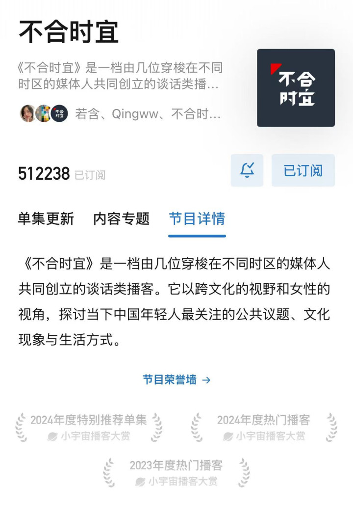 内容水准较高,有51万粉丝的播客节目《不合时宜》今年初曾发文称,他们的口播和定制广告定价分别为3.8万元和1.3万元,但他们曾在长达8个月的时间里只接到过一单商单。他们的主创在创作播客之外,均有其他工作,否则无法维持基本生活:“整个团队目前没有任何一个全职人员,因为营收不允许。”