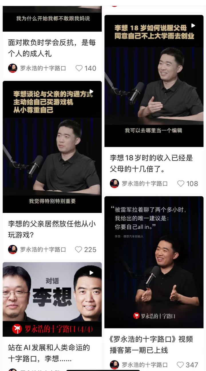《罗永浩的十字路口》首期对谈李想,长达3小时57分钟的视频播客不仅在B站上线,还被切割成了10余条1分钟左右的短视频,在抖音、小红书上持续发酵。随后,大量自媒体和网友主动二创、转发,让节目实现了二次甚至多次破圈。